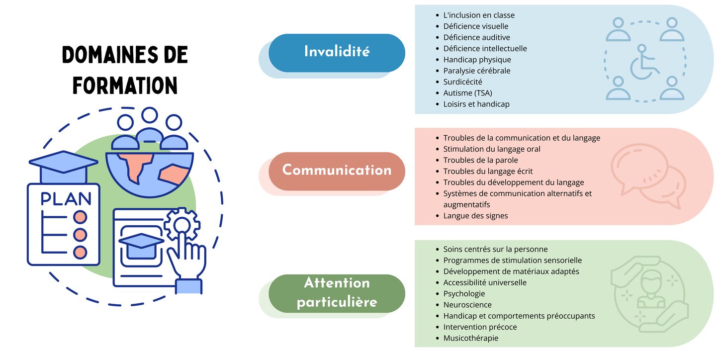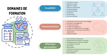 Il n'est pas nécessaire de souscrire à un seul cours ni de limiter la formation à un seul domaine. Nos contenus sont transversaux, c'est pourquoi les formations peuvent intégrer différents domaines au sein d'un même programme : handicap, communication, prise en charge spécifique et conseil spécialisé.